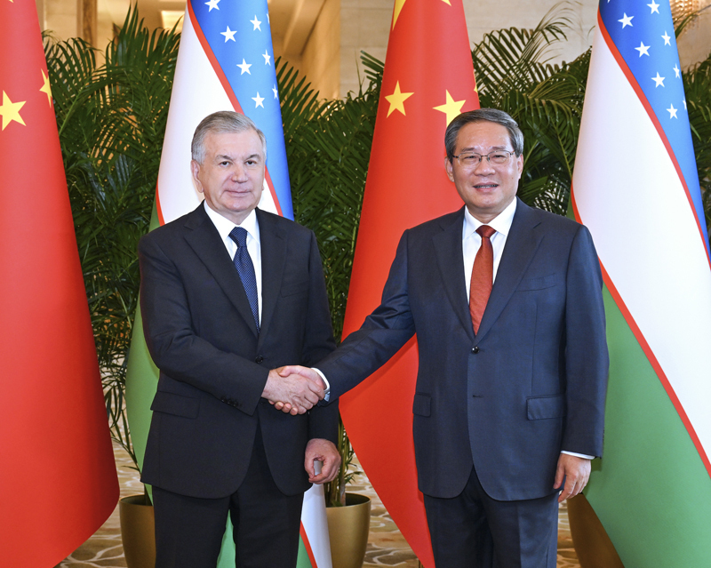 国务院总理李强2日上午在北京钓鱼台国宾馆会见来华出席2025年上海合作组织峰会和纪念中国人民抗日战争暨世界反法西斯战争胜利80周年活动的乌兹别克斯坦总统米尔济约耶夫。