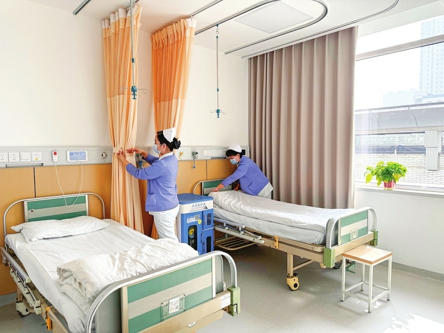 山西省第五人民医院(省老年医院)全面开展病房适老化改造工作,在已完成适老化改造的新病房内,护士们正在进行整理清洁。