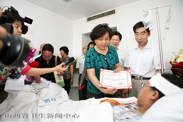 5月30日下午,省卫生计生委党组书记王进喜、省妇联主席王维卿等一行,前往山西省人民医院看望慰问了血染白衣的“尽职护士”聂晶晶。王维卿主席代表省妇联授予聂晶晶“山西省三八红旗手”荣誉称号。 5月27日晚,省人民医院胸外科一位患者欲跳楼轻生,当班护士聂晶晶奋力阻拦,在头部被打成重伤的情况下,依然紧紧抓住患者。她的事迹引起主要新闻媒体的高度关注,新华社、山西日报、山西人民广播电台、山西新闻网、黄河电视台、山西青年报、山西晚报、太原电视台等多家中央驻晋和省内主流媒体对聂晶晶的事迹进行了深入采访报道。新闻报道刊发后,引起强烈的社会反响,社会各界人士纷纷向聂晶晶表达了敬意和慰问。