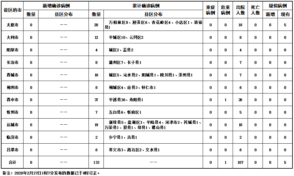 2020年2月27日0时至24时,山西省无新增新型冠状病毒肺炎确诊病例,累计报告确诊病例133例。新增治愈出院3例,累计治愈出院107例。现有在院隔离治疗确诊病例26例,其中危重症1例。无新增疑似病例,现有疑似病例5例。累计追踪到密切接触者4144人,当日解除医学观察17人,尚在医学观察的密切接触者142人。