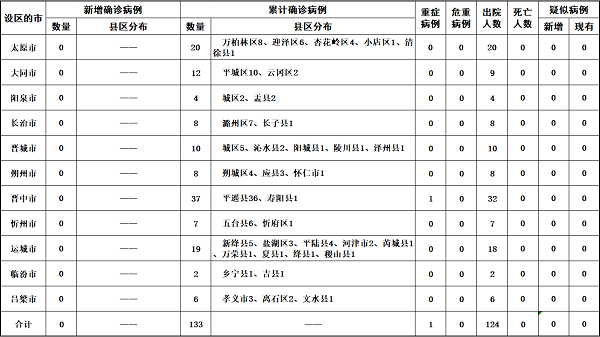 2020年3月3日0时至24时,山西省无新增新型冠状病毒肺炎确诊病例,累计报告确诊病例133例。新增治愈出院5例,累计治愈出院124例。现有在院隔离治疗确诊病例9例,其中重症1例。无新增疑似病例,现有疑似病例0例。累计追踪到密切接触者4162人,当日解除医学观察23人,尚在医学观察的密切接触者96人。