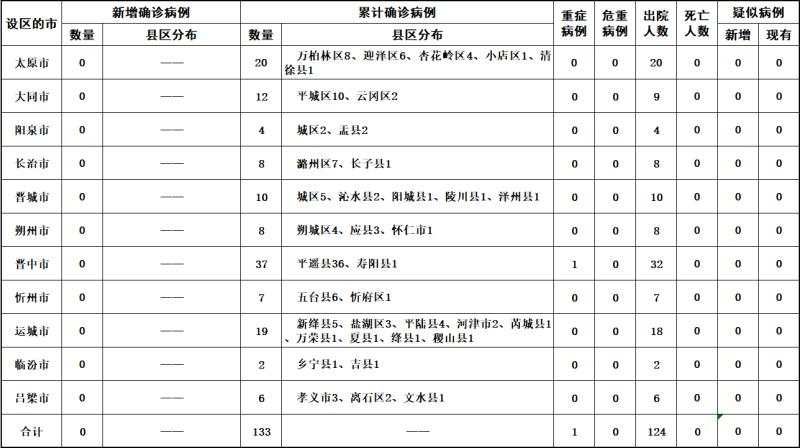 2020年3月4日0时至24时,山西省无新增新型冠状病毒肺炎确诊病例,累计报告确诊病例133例。无新增治愈出院病例,累计治愈出院124例。现有在院隔离治疗确诊病例9例,其中重症1例。无新增疑似病例,现有疑似病例0例。累计追踪到密切接触者4162人,当日解除医学观察20人,尚在医学观察的密切接触者76人。 单位:例