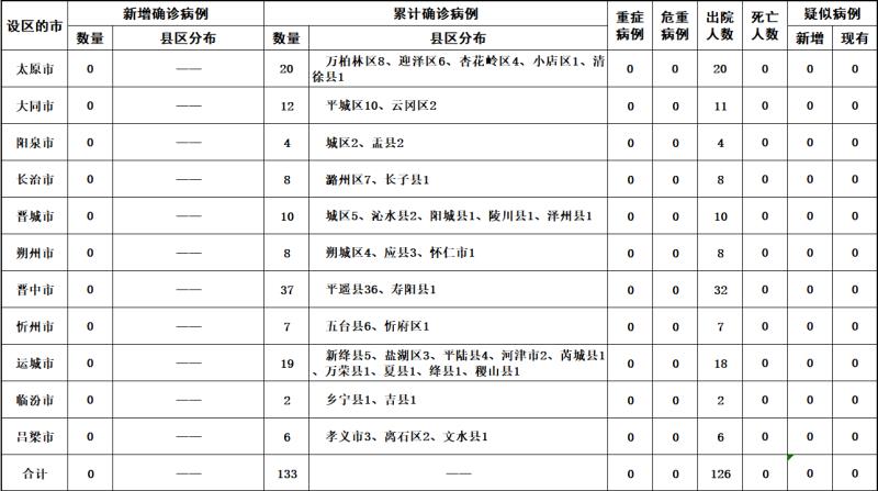 2020年3月8日0时至24时,山西省无新增新型冠状病毒肺炎确诊病例,累计报告确诊病例133例。无新增治愈出院病例,累计治愈出院126例。现有在院隔离治疗确诊病例7例。无新增疑似病例,现有疑似病例0例。累计追踪到密切接触者4184人,当日解除医学观察15人,尚在医学观察的密切接触者56人。