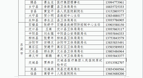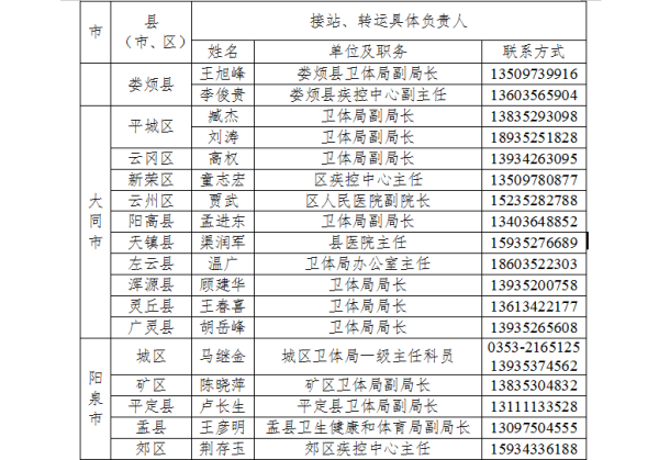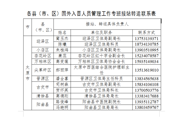 为切实做好防止国外疫情输入工作,严格落实国外入晋人员点对点闭环管理,方便国外入晋人员及时联系属地落实隔离管理措施,我省以县为单位成立了国外入境人员管理工作专班,明确了接站转运工作联系人,现将各县(市、区)联系人电话公告如下: 监督电话:0351-3581083