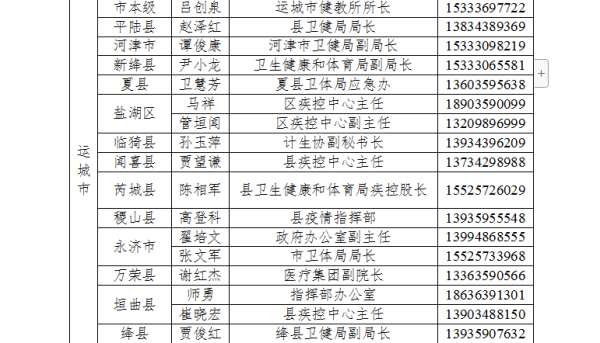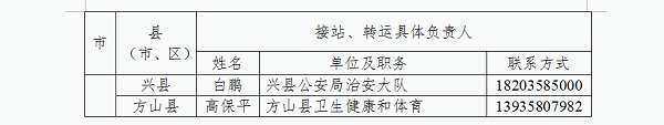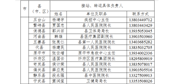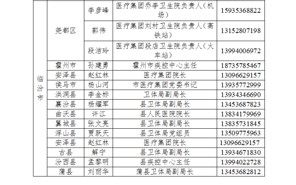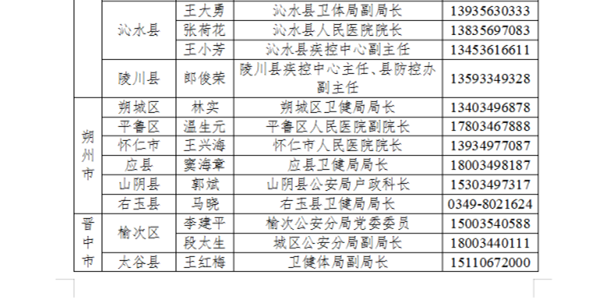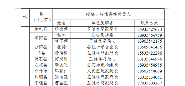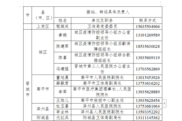 为切实做好防止国外疫情输入工作,严格落实国外入晋人员点对点闭环管理,方便国外入晋人员及时联系属地落实隔离管理措施,我省以县为单位成立了国外入境人员管理工作专班,明确了接站转运工作联系人,现将各县(市、区)联系人电话公告如下: