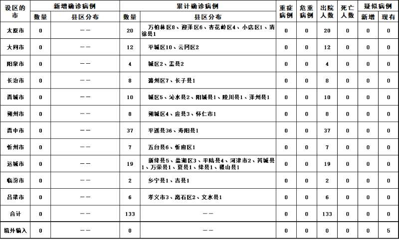 2020年3月22日0时至24时,山西省本地无新增新型冠状病毒肺炎确诊病例,累计报告确诊病例133例,治愈出院133例。无新增疑似病例,现有疑似病例0例。