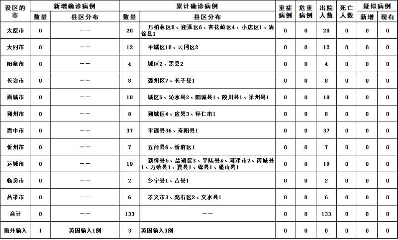 2020年3月28日0时至24时,山西省本地无新增新型冠状病毒肺炎确诊病例,累计报告确诊病例133例,治愈出院133例。无新增疑似病例,现有疑似病例0例。