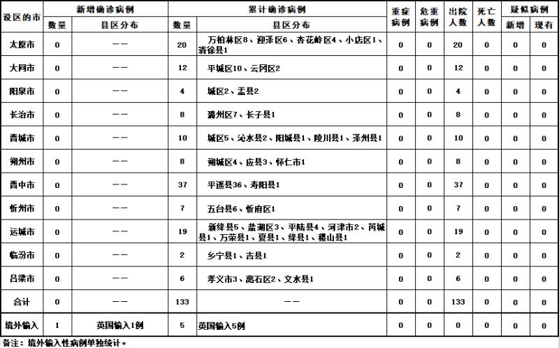 2020年4月4日0-24时,山西省本地无新增新型冠状病毒肺炎确诊病例,累计报告确诊病例133例,治愈出院133例。无新增疑似病例,现有疑似病例0例。