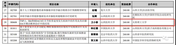 近日获悉,山西医科大学第二医院卫小春教授团队的研究项目“TSP-1、Ihh和HDAC4在关节软骨退变发生机制中的作用及其在膝OA早期诊断和治疗中的应用”成功中标国家自然科学基金委的区域创新发展联合基金。本项目同太原理工大学桑胜波教授团队进行深入合作,医工结合,为膝关节OA的早期诊断与治疗提供新理论、探索新方法。