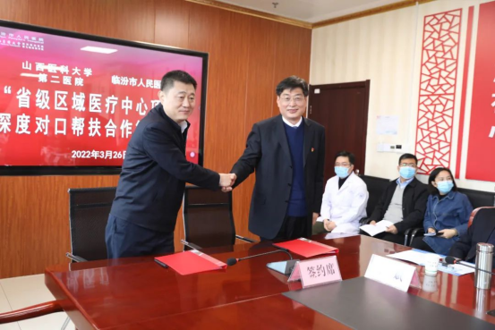 3月26日,山西医科大学第二医院与临汾市人民医院深度对口帮扶合作签约仪式在临汾市人民医院行政楼会议室举行。临汾市人民政府副市长张潞萍、山西医科大学第二医院院长赵斌出席仪式并讲话。山西医科大学第二医院副院长董红霖,医务处副处长宋文慧,骨科博士、硕士生导师王小虎,临汾市人民政府相关人员,临汾市人民医院党政班子成员及相关科室主任参加了签约仪式,临汾市人民医院党委书记黄新升主持仪式。