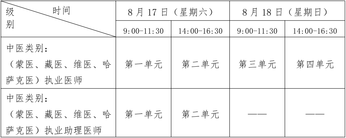 考试实行计算机化考试,军队现役人员加试军事医学、院前急救岗位和儿科专业加试相应内容。中医类别蒙医、藏医、维医、哈萨克医专业实行纸笔考试。统一考试时间如下: