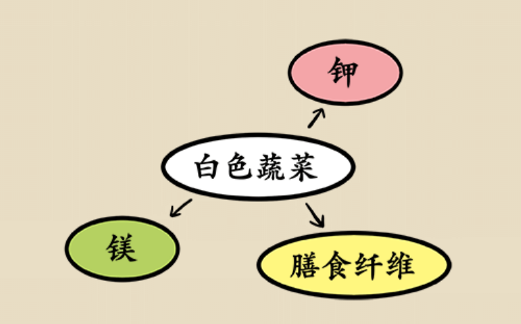 白色蔬菜不含色素,但富含膳食纤维及钾、镁等微量元素,可提高免疫力、保护心脏、调节视觉、安定情绪,而且对高血压和心肌病也有益处。