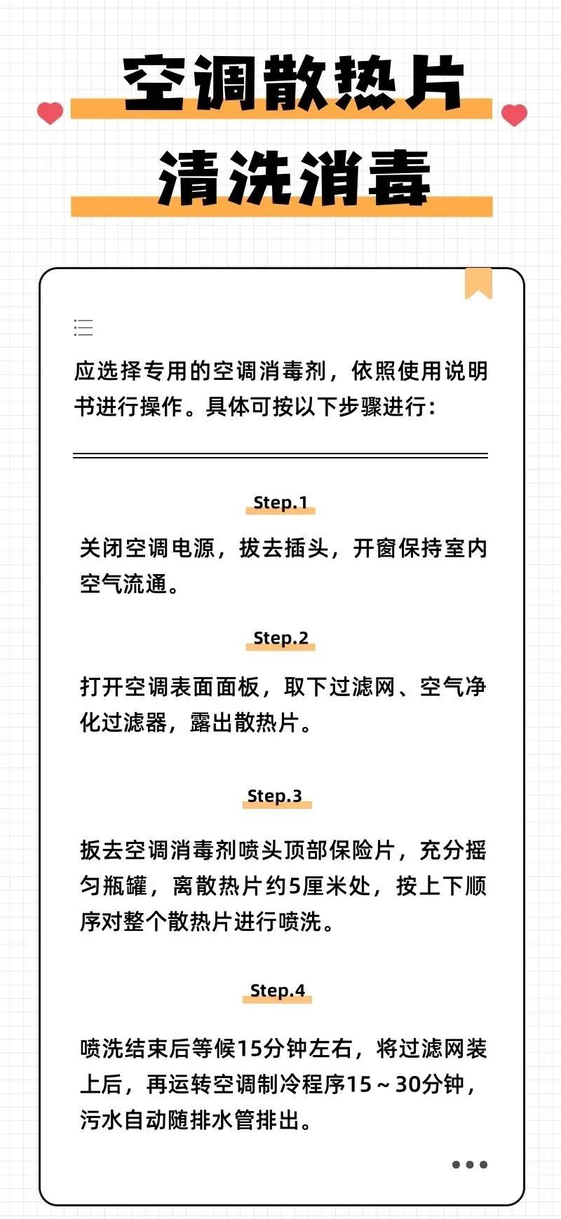 高温持续,暑热难消 不少网友调侃 夏天的命是空调给的! 提醒大家 科学清洁消毒空调 避免健康风险 科学清洁消毒空调 每年在换季的时节空调首次开机前都应该进行彻底的清洁和消毒,但是在夏季和冬季,如持续使用空调,须对空调每月清洁消毒1次。 将窗户打开、通风,先用抹布把空调外壳擦拭一遍,然后把外壳打开,将滤网拆卸下来,在水龙头下反向将灰尘冲洗干净。 如果灰尘黏附在滤网上,可将过滤网放入洗衣粉水里泡一会儿,用刷子刷洗,最后用流动的自来水对着过滤网冲一遍,用干净的抹布慢慢抹干,然后将洗净的过滤网装回空调内部,将空调外壳关闭即可。 家庭空调一般情况下清洁过滤网就可以了,当怀疑散热片受到污染(开空调后出现异味),还需要对散热片进行清洁消毒。