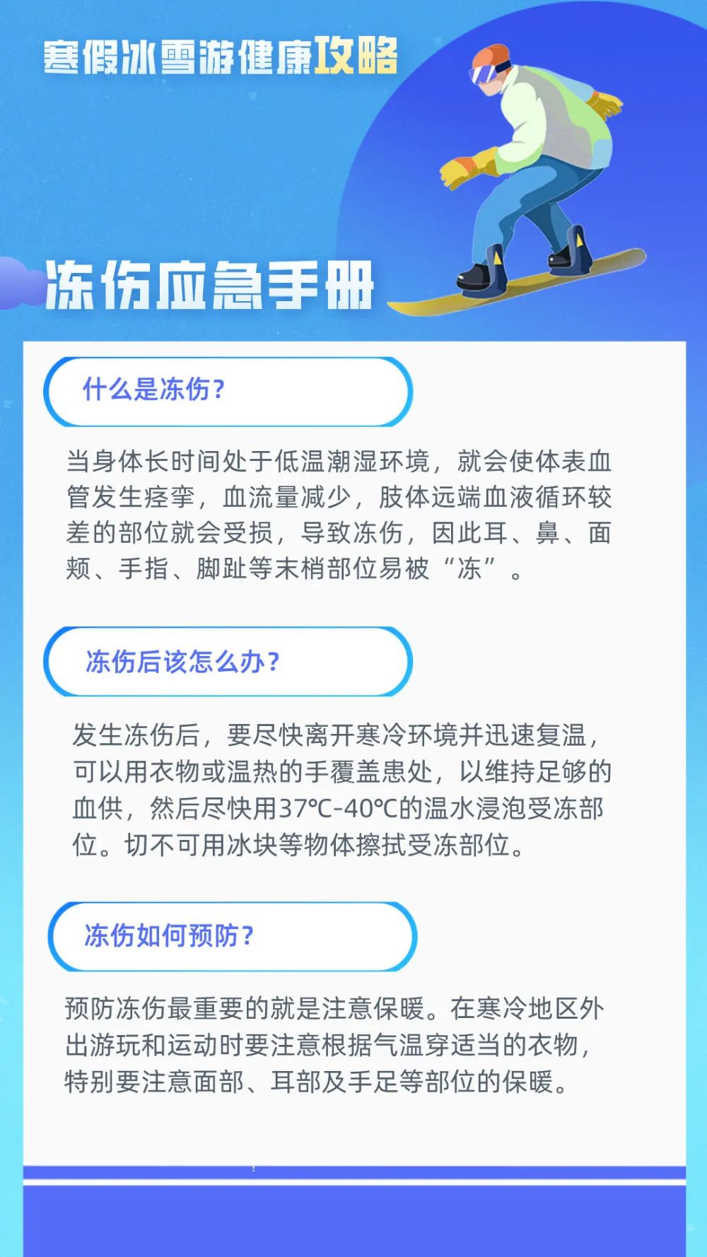 专家提醒,预防冻伤最重要的就是注意保暖。在寒冷地区外出游玩和运动时要注意根据气温穿适当的衣物,特别要注意面部、耳部及手足等部位的保暖。此外,要注意保持日常饮食营养均衡和适当的体育锻炼,保证摄入充足的热量,增强对寒冷的抵抗力。