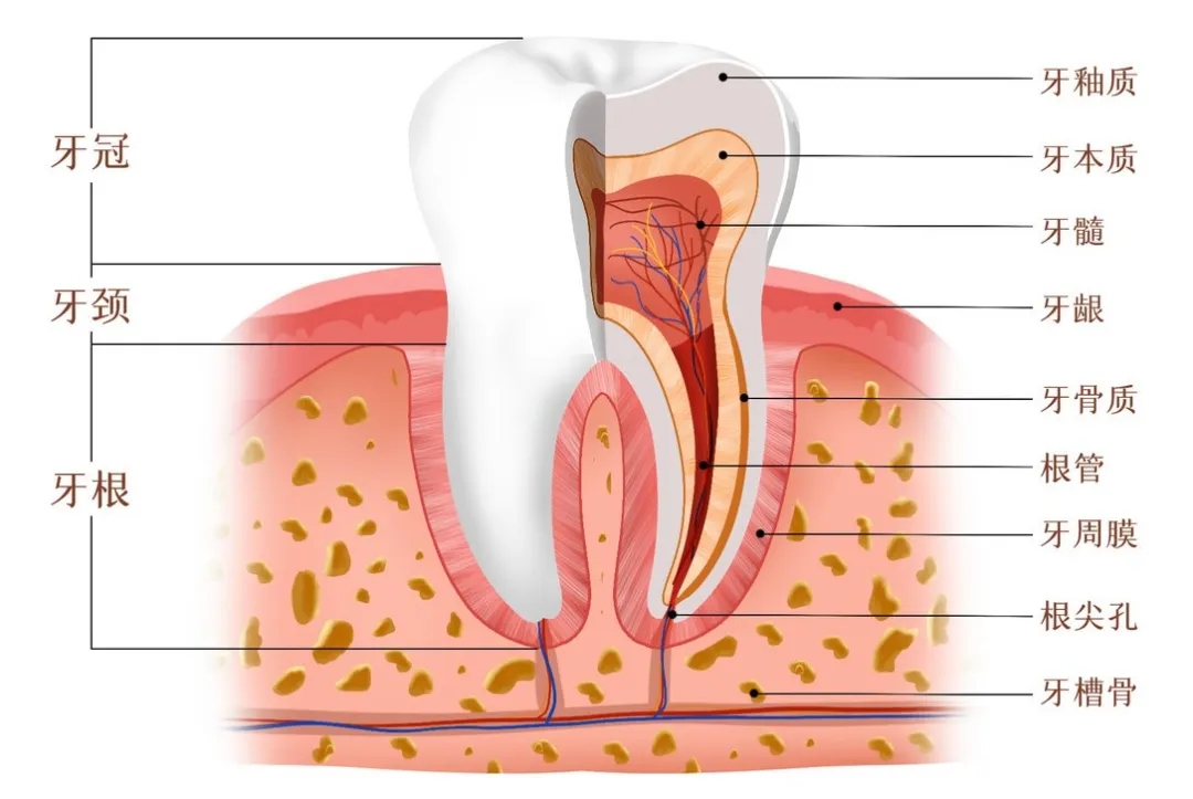 牙齿解剖结构分为牙龈上方的牙冠部,牙槽骨内的牙根部以及连接二者的牙颈部;牙齿的组织结构由牙釉质、牙本质、牙骨质和其内部的牙髓组成。