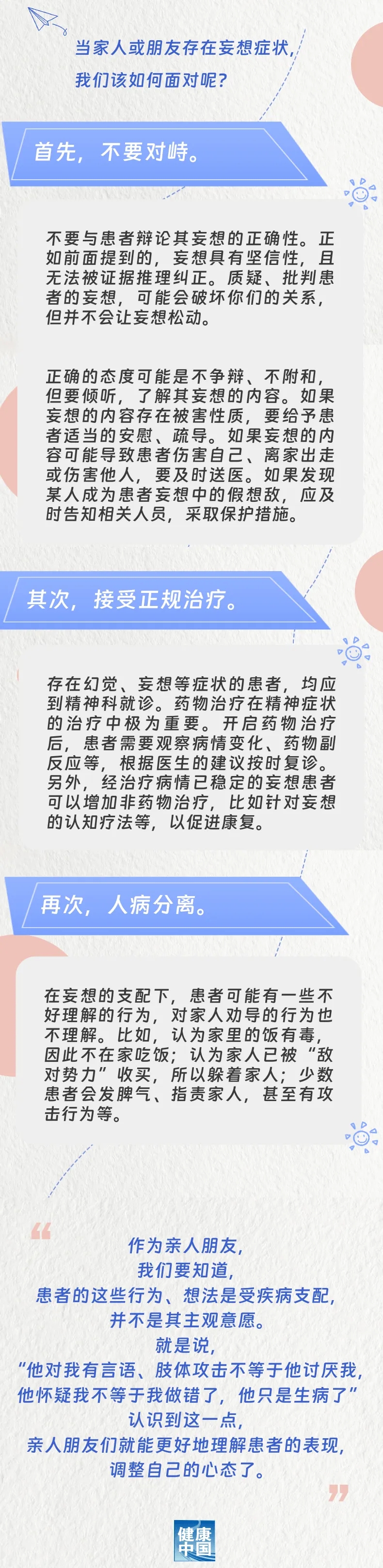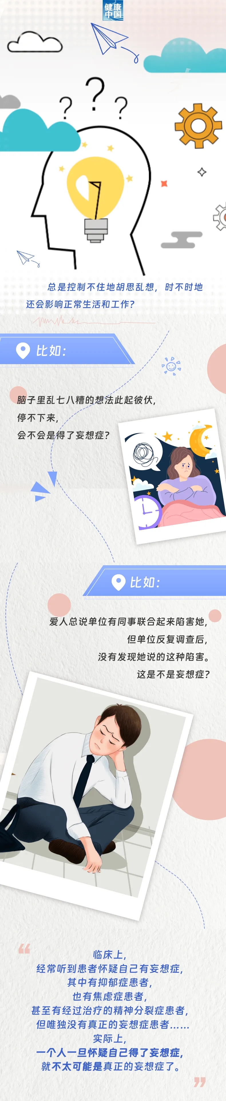妄想≠胡思乱想 日常生活中,人们会使用妄想这个词,代表虚妄的想法或胡思乱想。但作为一种医学诊断症状,妄想不等于胡思乱想,而是有其具体的定义。许又新教授所著《精神病理学》将妄想定义为:一种个人所独有的和与自我有切身关系的坚信,它不接受事实和理性的纠正。 这是什么意思呢?首先,妄想是关于“我”的,妄想的内容与个人的需要、恐惧或安全密切相关。例如,“我”伟大,“我”有罪,“我”的配偶与某人有暧昧关系,有人要加害“我”,某人钟情于“我”,人们咳嗽是针对“我”等。 所以,不管一个想法看起来多么荒谬离奇,如果内容不是关于“我”的,就算不得精神病学上的妄想。 其次,妄想必须是一种“坚信”,它不接受事实和理性的纠正,可以说是不可动摇、不可纠正的。在临床上,常常看到患者对其妄想内容有100%的笃定,不管他人拿出怎样的铁证来证伪,不管关于其妄想内容不可能性的推理如何严丝合缝,妄想者都不会有丝毫动摇。 相反,有些患者有时会描述自己的一些奇怪想法,但自己并不坚信,这就不是妄想。比如一名神经症患者说多年来自己头上都有一个洞,十分难受,而且影响记忆。这听起来言之凿凿,然而,如果医生认真与其核实,是“一定”有个洞,还是对某种“感觉”的描述,患者就会承认,他自己也不确定。 了解妄想性障碍 事实上,没有医生会给患者做出妄想症这个诊断。因为,精神疾病的诊断系统中并没有妄想症。与一般意义上的妄想症最贴近的精神科诊断,是妄想性障碍。 妄想性障碍又称偏执性障碍,以一种或一整套相互关联的系统的妄想为主要表现。 要诊断为妄想性障碍,患者的妄想要持续3个月以上。妄想是系统的、围绕一定主题的,其内容并不“古怪”,常与现实有某种程度上可理解的联系。妄想性障碍患者如果有其他症状,比如幻觉、错觉等,也与妄想主题一致。当不涉及妄想内容时,患者的生活、工作大多与常人无异,但涉及妄想时又坚信不疑,完全无法接受事实和理性的纠正。 另外,妄想性障碍并不常见。2019年北京大学第六医院黄悦勤教授牵头完成的《中国精神卫生调查》显示,妄想性障碍终生患病率小于0.1%。美国普通人群为0.2%~0.3%,每10万人口年新发患者数为1~3人。妄想性障碍最常见的亚型是被害型。在嫉妒型妄想性障碍患者中,男性多于女性。 除妄想性障碍外,精神科很多疾病的患者都可能有妄想的症状,比如精神分裂症、双相障碍、抑郁症、痴呆、酒药依赖等患者。