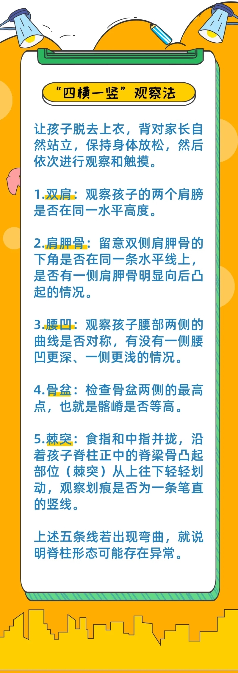 守护孩子的脊柱健康,家庭是第一道“岗哨”。家长掌握简单、有效的自查方法,能第一时间发现孩子脊柱的异常信号。这里教大家一个简单易操作的“四横一竖”观察法,在家就能给孩子做筛查。